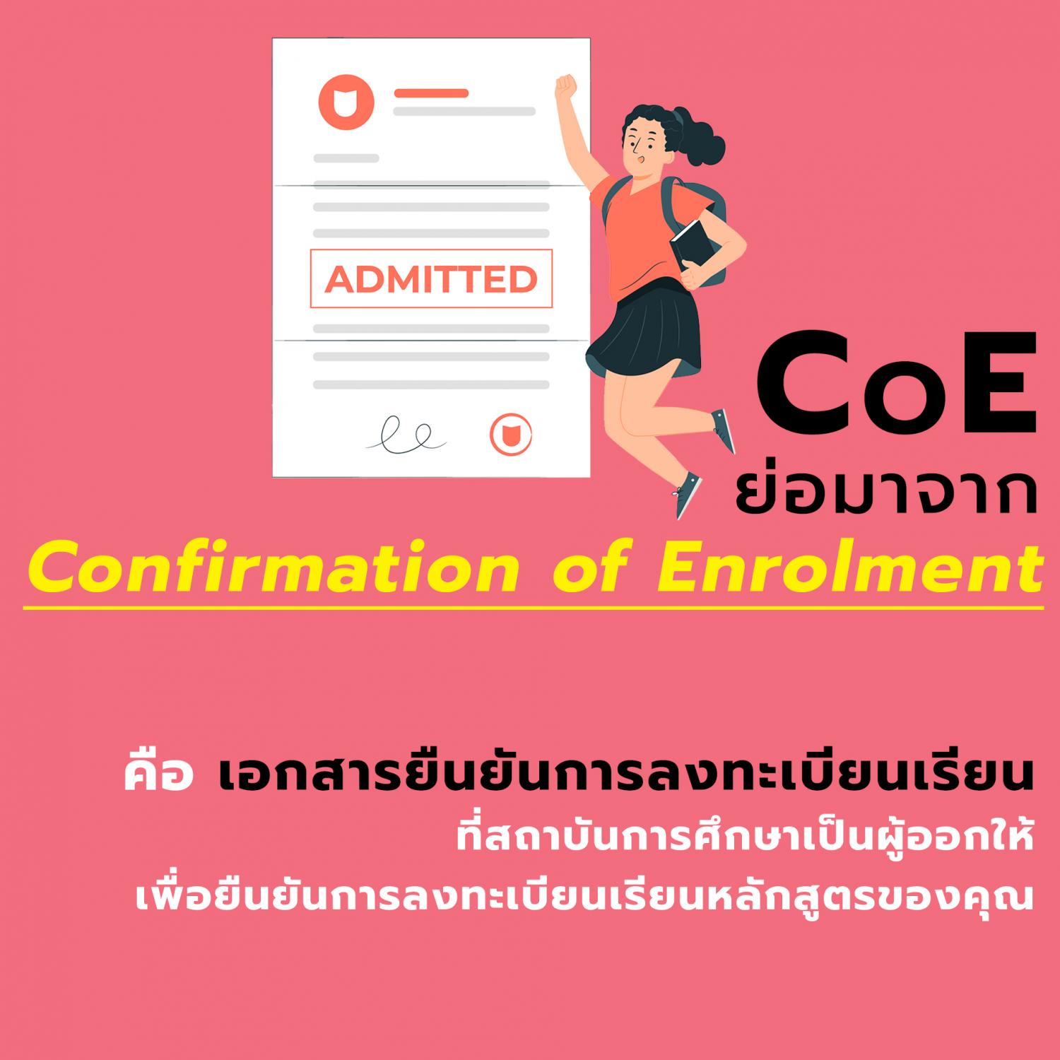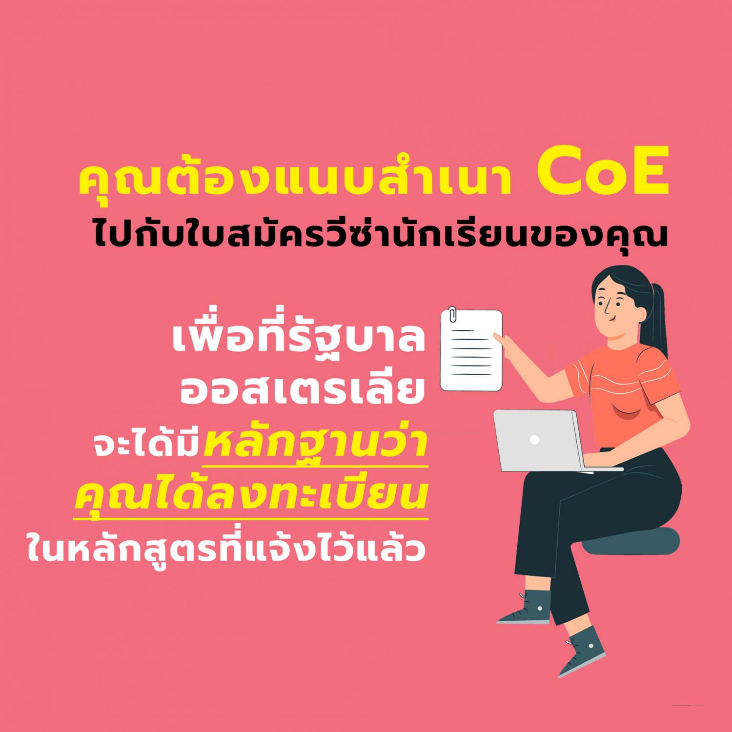 COE เป็นเอกสารสำคัญที่นักเรียนต่างชาติทุกคนต้องมี ก่อนยื่นขอวีซ่าเรียนต่อออสเตรเลีย หรือบางประเทศที่ใช้ระบบคล้ายกัน เพราะเป็นหลักฐานยืนยันการรับเข้าเรียนอย่างเป็นทางการจากสถาบัน
